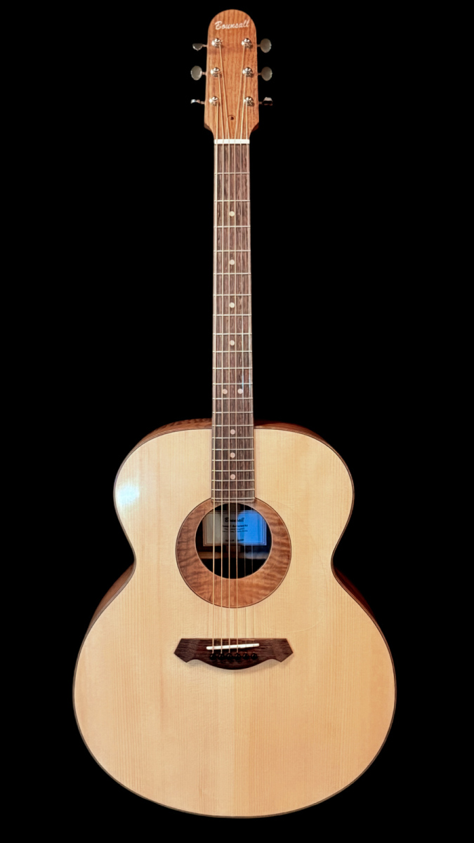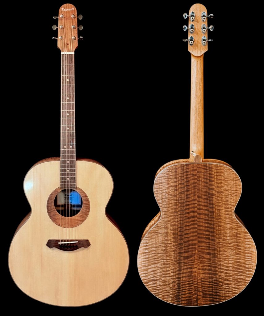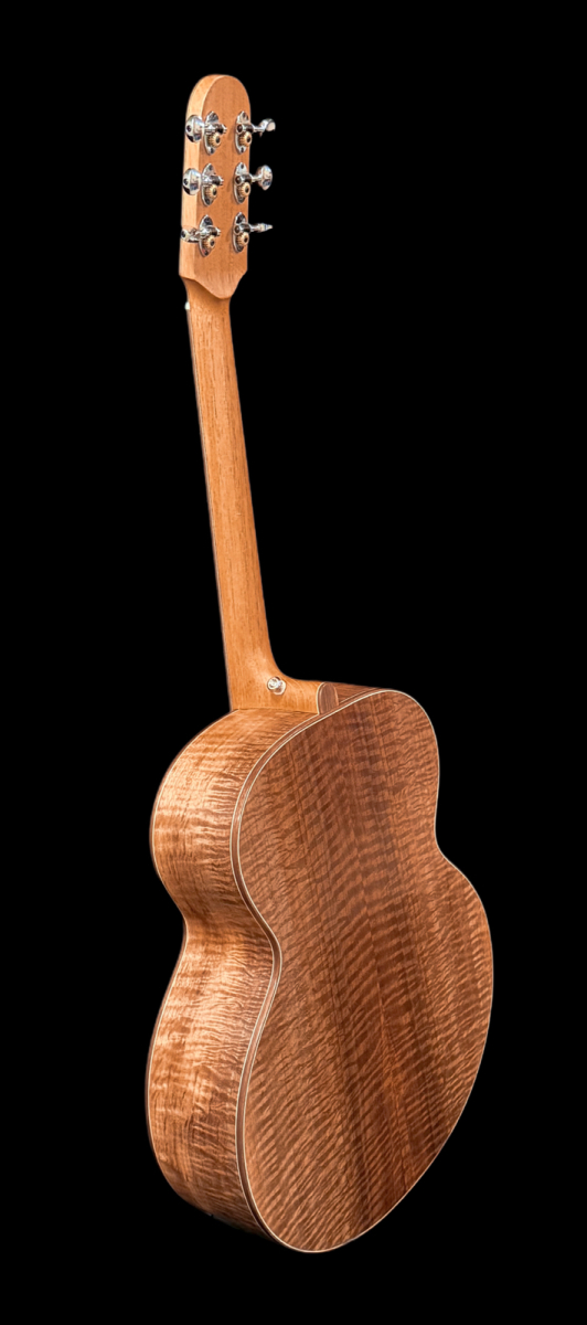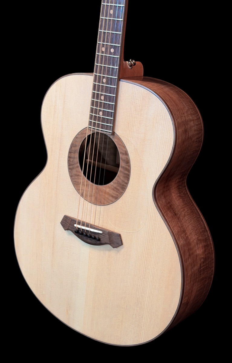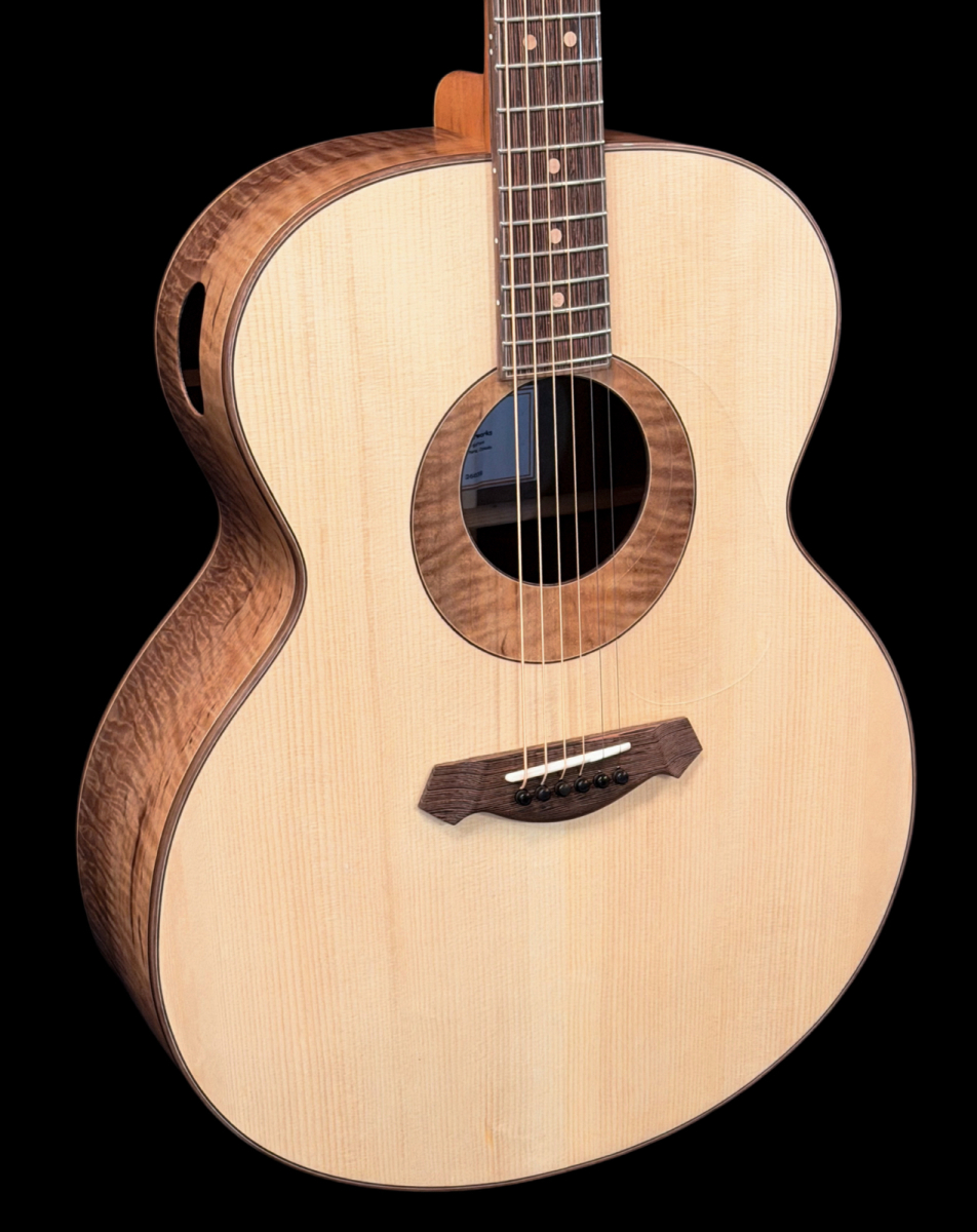 Here’s a wonderful large bodied guitar. The 17” wide super jumbo size delivers a big powerful voice with oodles of low-end response while retaining crisp highs and good note separation. Complimenting the guitar’s dimensions, the Adirondack spruce top is not only capable of articulating intricate fingerstyle playing but also provides the headroom necessary to easily handle even the most aggressive strummer. An internal buttress of carbon fibre rods provides stiffness and structural support to the upper end of the guitar. A side sound port in the upper bout helps direct sound towards the player. The curly Claro walnut back and sides provide a visually stunning appearance. A remarkable looking and sounding guitar.