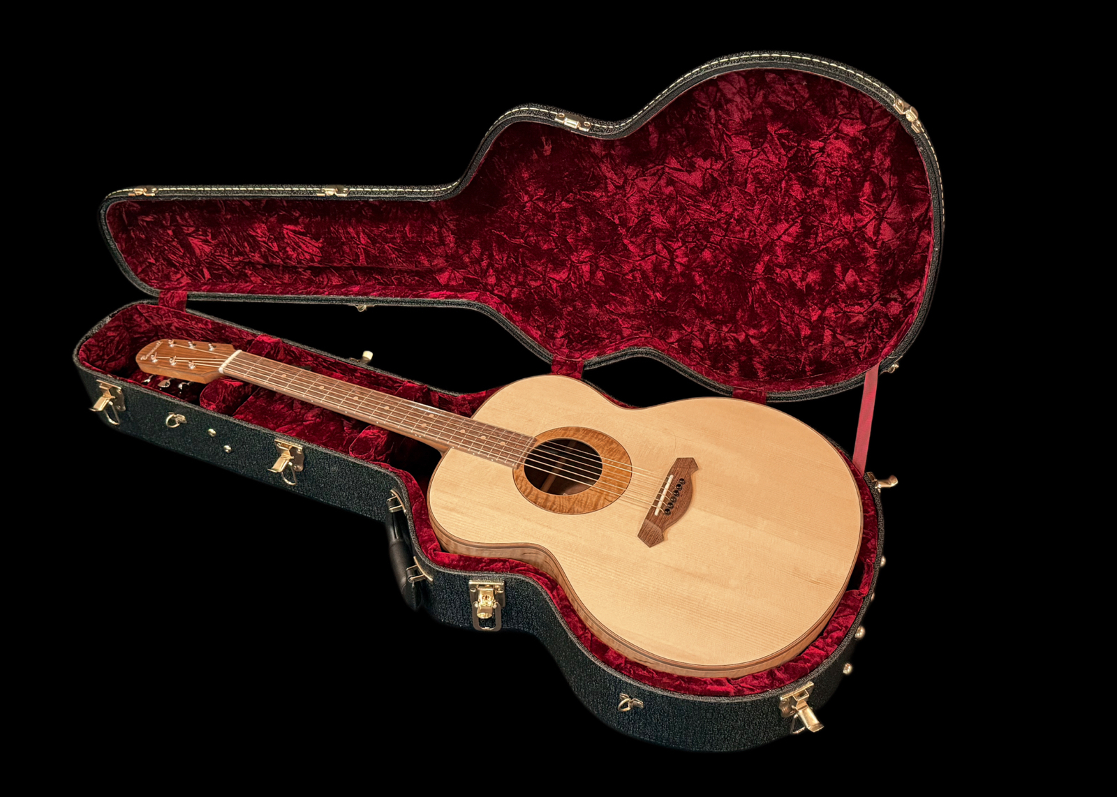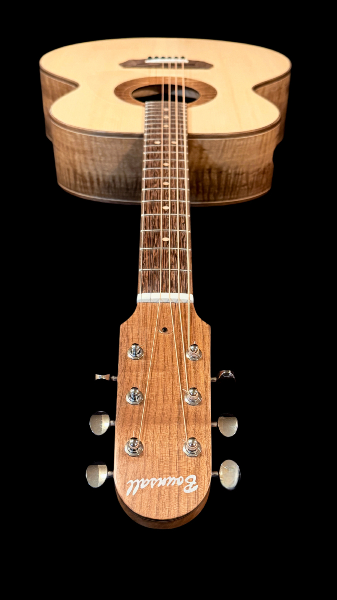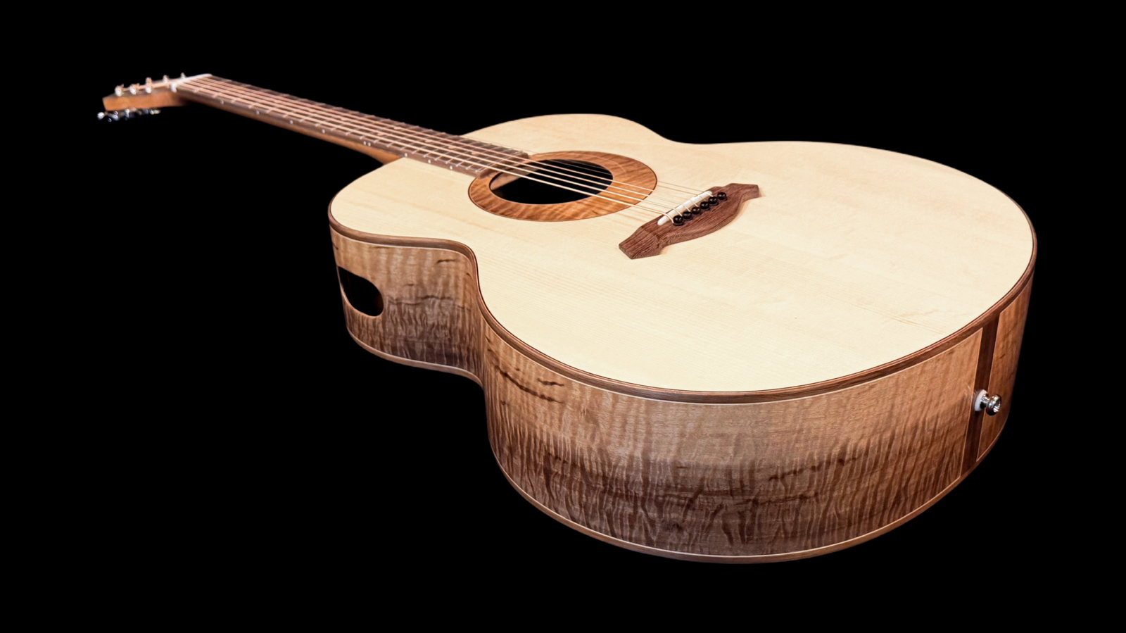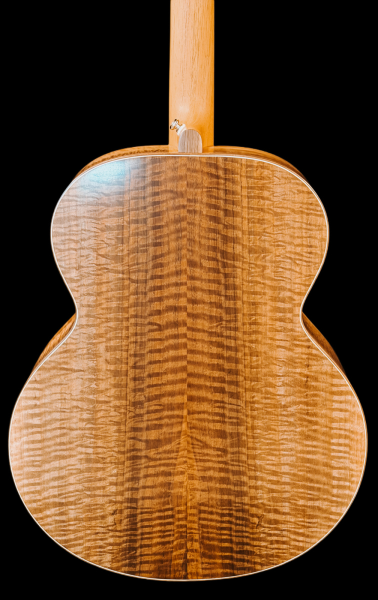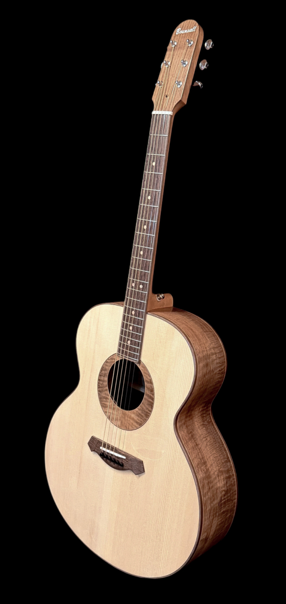 Here’s a wonderful large bodied guitar. The 17” wide super jumbo size delivers a big powerful voice with oodles of low-end response while retaining crisp highs and good note separation. Complimenting the guitar’s dimensions, the Adirondack spruce top is not only capable of articulating intricate fingerstyle playing but also provides the headroom necessary to easily handle even the most aggressive strummer. An internal buttress of carbon fibre rods provides stiffness and structural support to the upper end of the guitar. A side sound port in the upper bout helps direct sound towards the player. The curly Claro walnut back and sides provide a visually stunning appearance. A remarkable looking and sounding guitar.