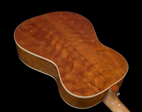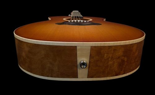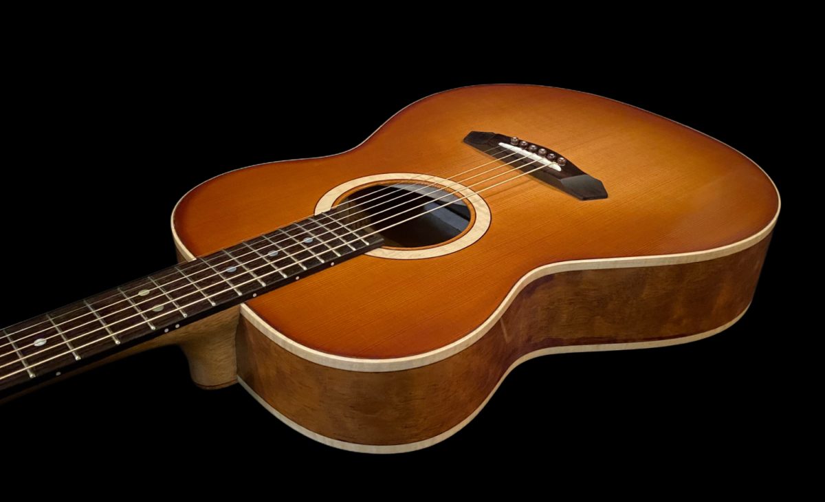 This small bodied acoustic features quilted mahogany back and sides paired with a Douglas fir top in a lovely honeyburst finish. The tone is warm, even and smooth with a surprising amount of depth. The 00 size is very comfortable to play while seated, making it a favourite for songwriters and an ideal companion for sitting on the couch and noodling. Comfortable, even, and smooth. This guitar is a treat to play and is hard to put down. It comes complete with a premium JJB surface mount pickup already installed and includes a quality hardshell case.